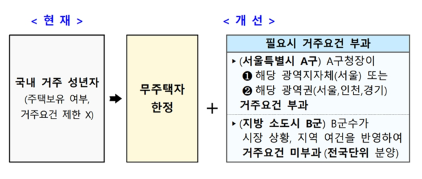 개편된 제도에서는 무주택자만 청약에 참여할 수 있게 되어, 실수요자들에게 보다 유리한 환경을 제공하게 됩니다. 또한, 거주 요건을 부여할 수 있어, 특정 지역에서 거주하는 사람만 청약을 신청할 수 있게 됩니다. 예를 들어, 지자체는 해당 지역 내 거주자만 청약에 참여하도록 설정할 수 있습니다. 이는 지역별 수요자 우선의 원칙을 적용한 개편안입니다.